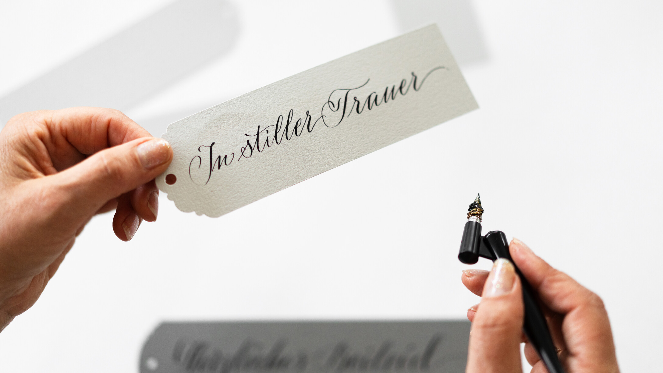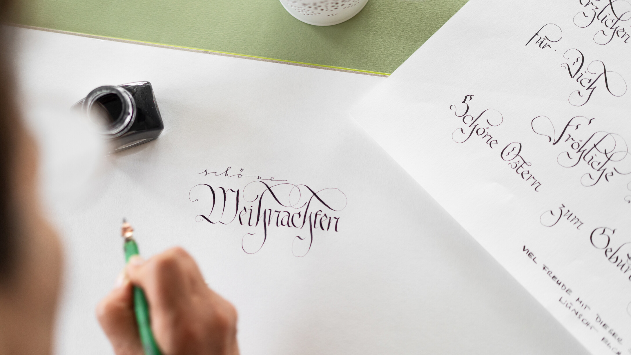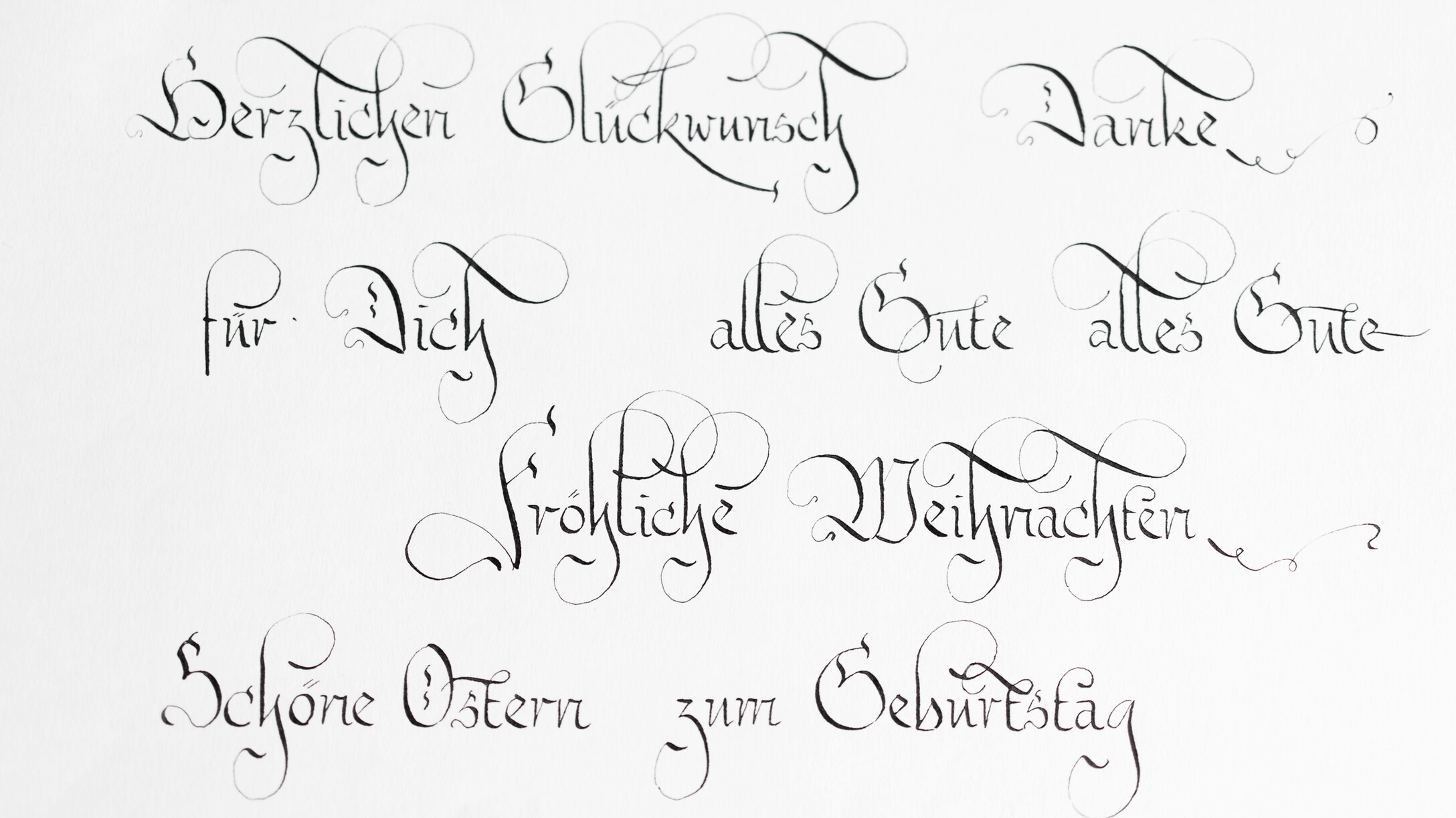 Diese schwungvoll geschriebene Schrift wird mit einer Spezialfeder, der Röhrchenfeder geschrieben, durch ihre hohe Elastizität lassen sich tolle Schwünge schreiben. Sie eignet sich hervorragend für Überschriften und als Abschlussschrift (äußerer Ring) bei Kreisbildern.