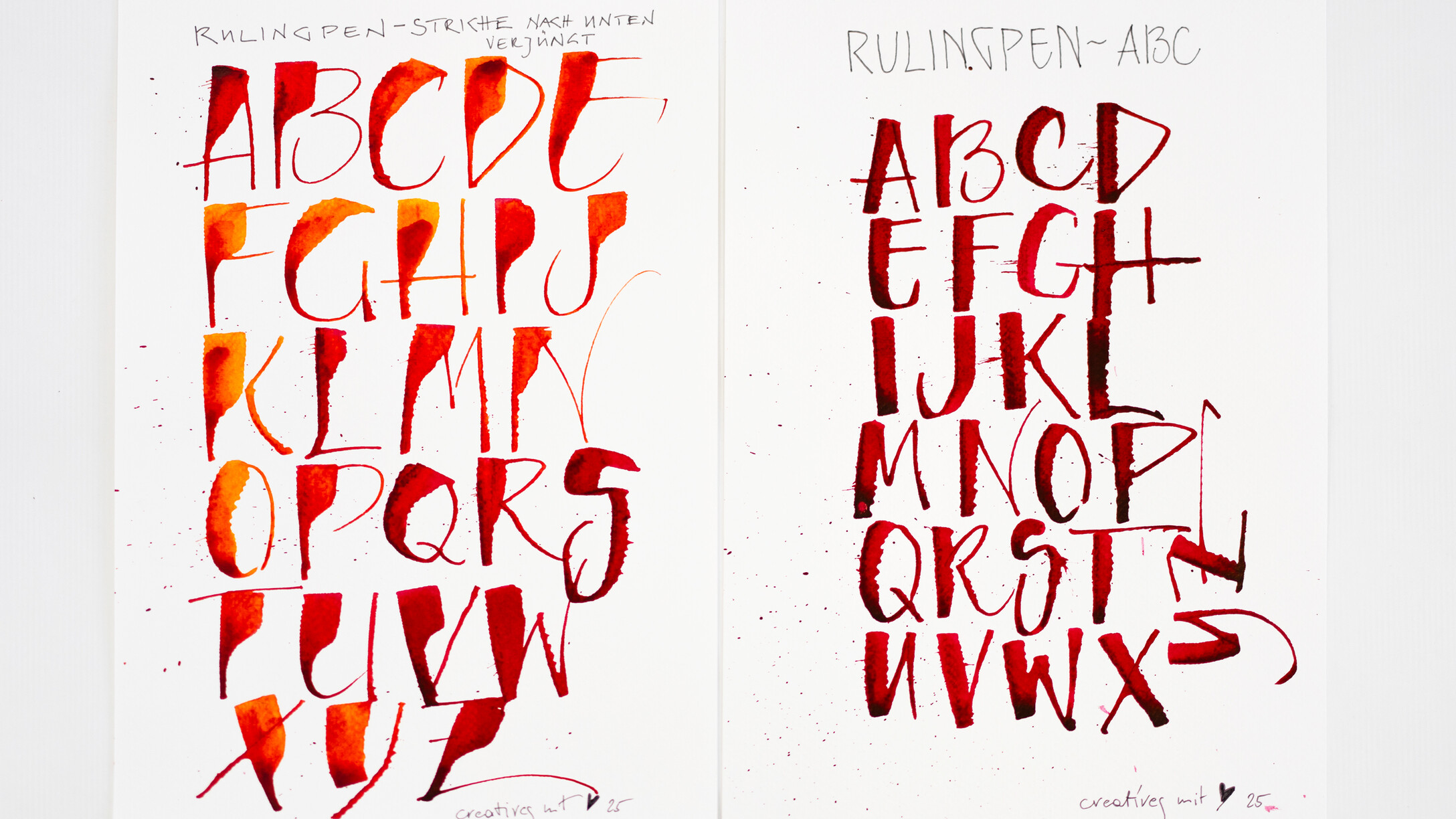 Typischerweise bestehen die zweiteilige Feder mit Stellschraube aus robustem Stahl oder Messing, was für eine langlebige Schreibspitze sorgt. Der Griff des Rulingpens ist meist aus Holz gefertigt. Durch seine spezielle Bauweise ermöglicht der Rulingpen eine individuelle Steuerung, was je nach Schreibgeschwindigkeit, Papieroberfläche und Haptik zu unterschiedlichen, oft faszinierenden Effekten führt. Dank dieser Kombination aus technischen Details und handwerklicher Qualität zeige ich euch die vielfältigen kreativen Möglichkeiten dieser speziellen Feder und ihr könnt gespannt sein, was Spannendes entsteht.