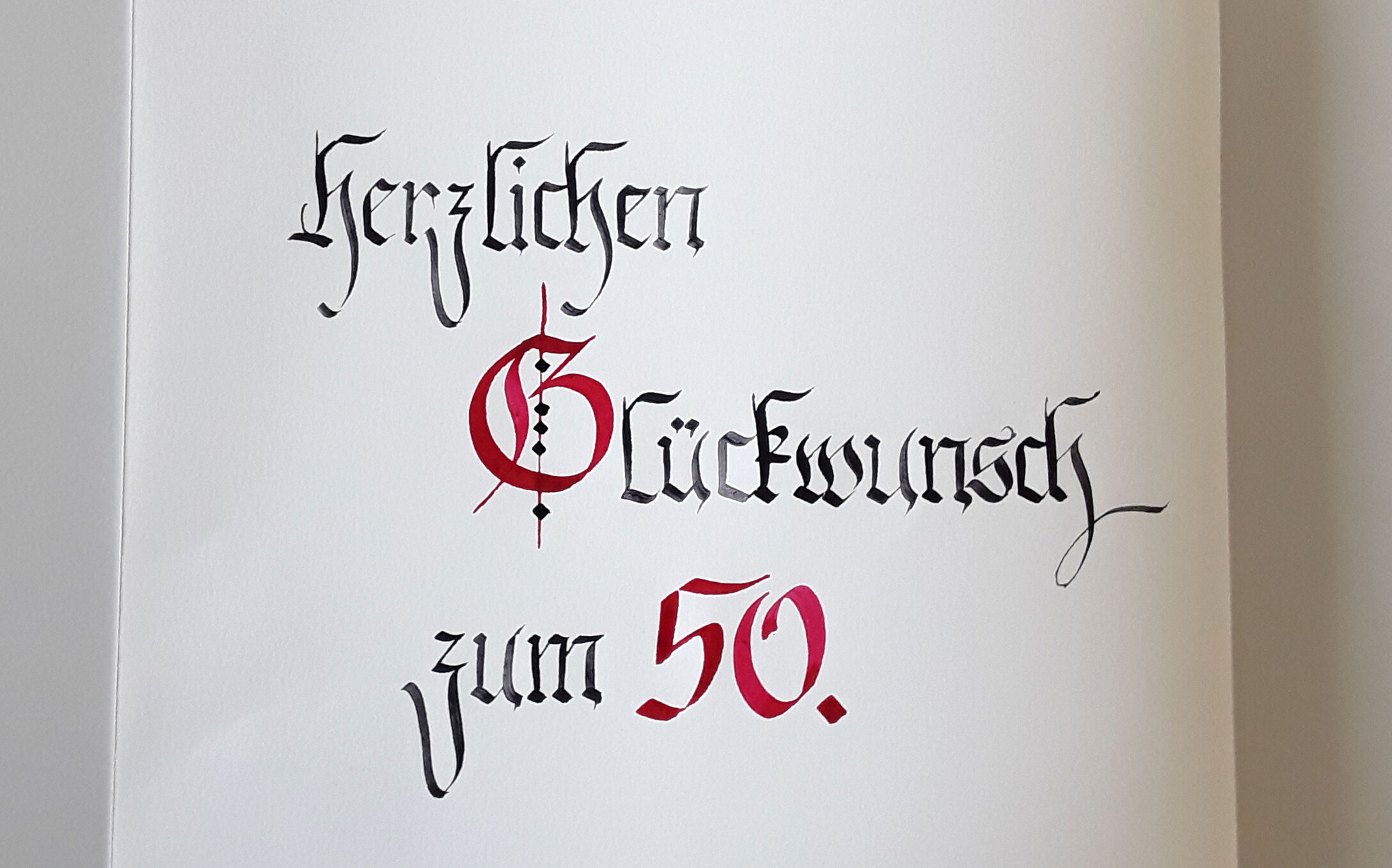 Die kursive Schrift entstand ca. im 14. Jhd., zeichnet sich durch ihre Schräglage aus und wird ebenfalls mit der Breitfeder geschrieben. Es gibt zahlreiche Varianten, darunter die Moderne Kursive mit ihren ausgeprägten Schwüngen mit denen tolle Akzente erzielt werden.