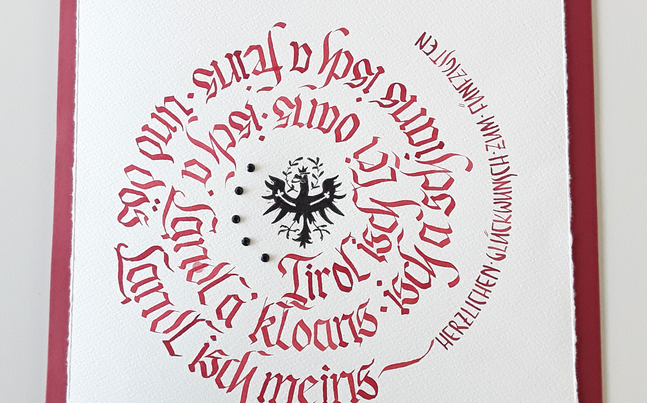 Die Fraktura wird ebenfalls mit der Breitfeder geschrieben und zählt zu den gebrochenen Schriftarten, dh. die Bögen und Rundungen werden mit einem sichtbaren Knick geschrieben. Vom 16. bis 20. Jhd. war sie die meisverbreitete Druckschrift im deutschsprachigen Raum. Diese Schrift ist eine sehr schöne, vielseitig einsetzbare Zierschrift.