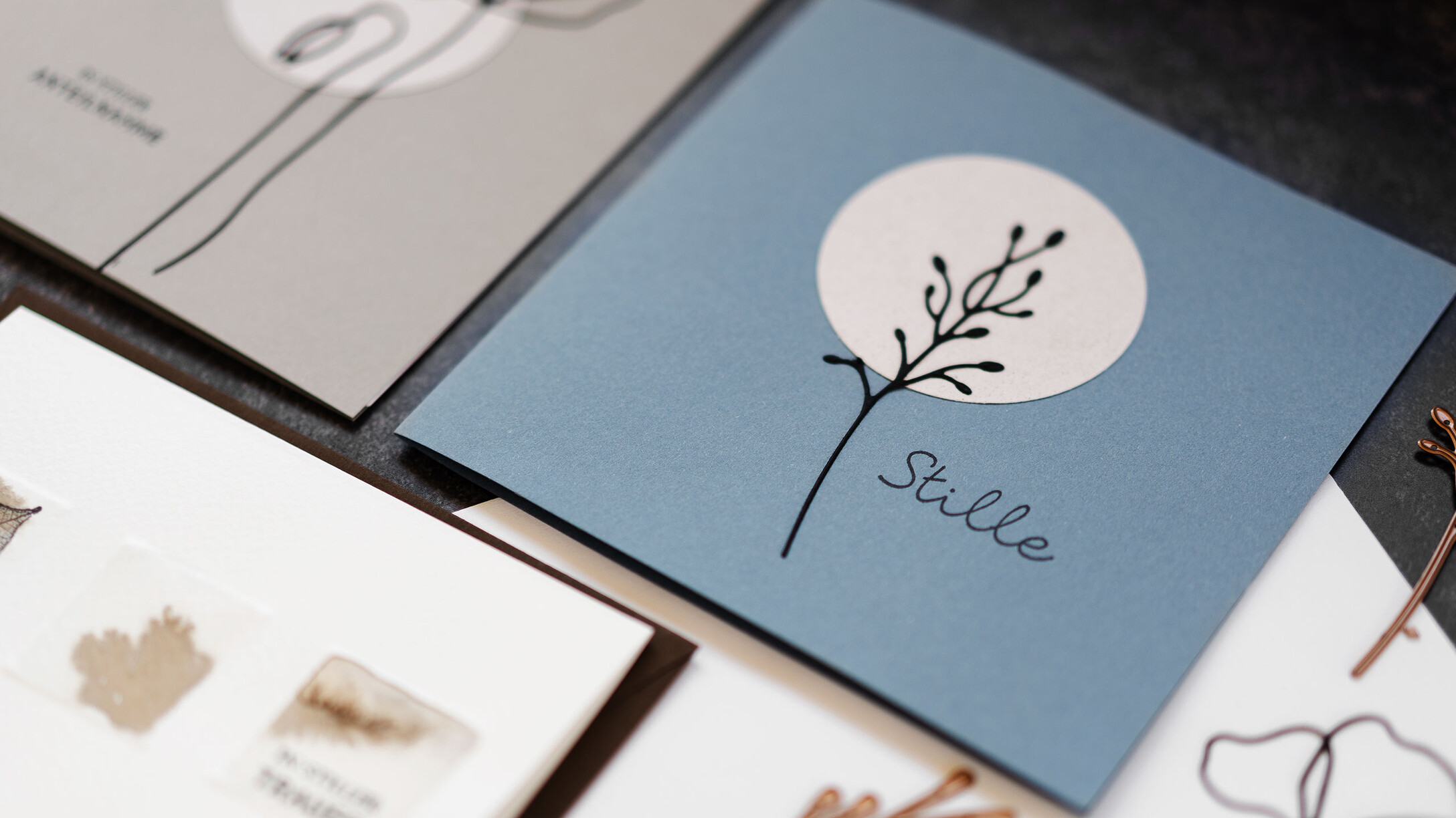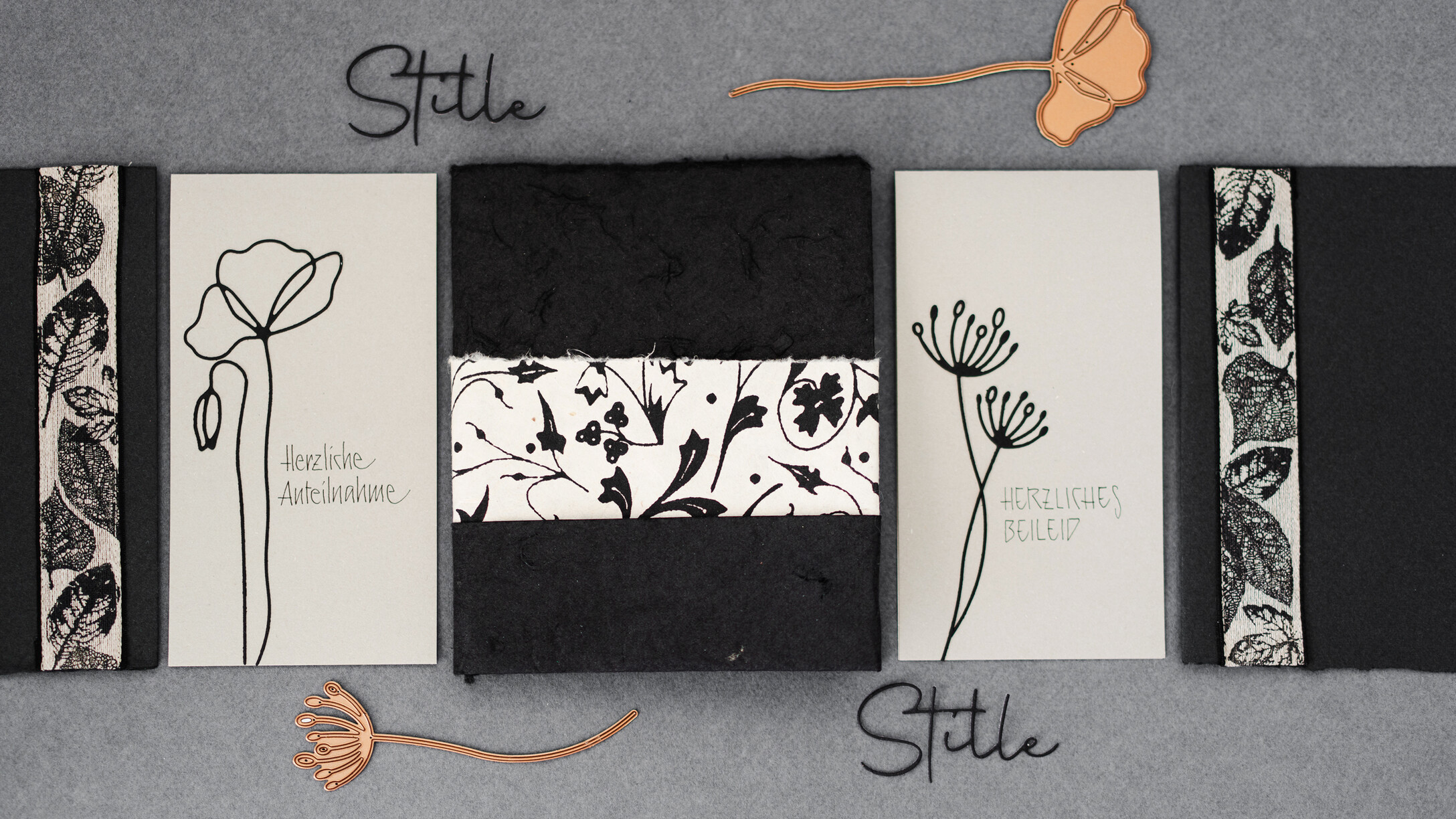 In diesem speziellen Kurs entstehen edle Trauerkarten, teilweise mit handgefertigtem Kuvert. Verschiedene Techniken wie Prägen, Stempeln, Aquarellieren und Falten kommen zum Einsatz. Als Vorlage dienen Musterkarten, es können auch eigene Kreationen umgesetzt werden, wer möchte kann die Karten auch gleich beschriften.