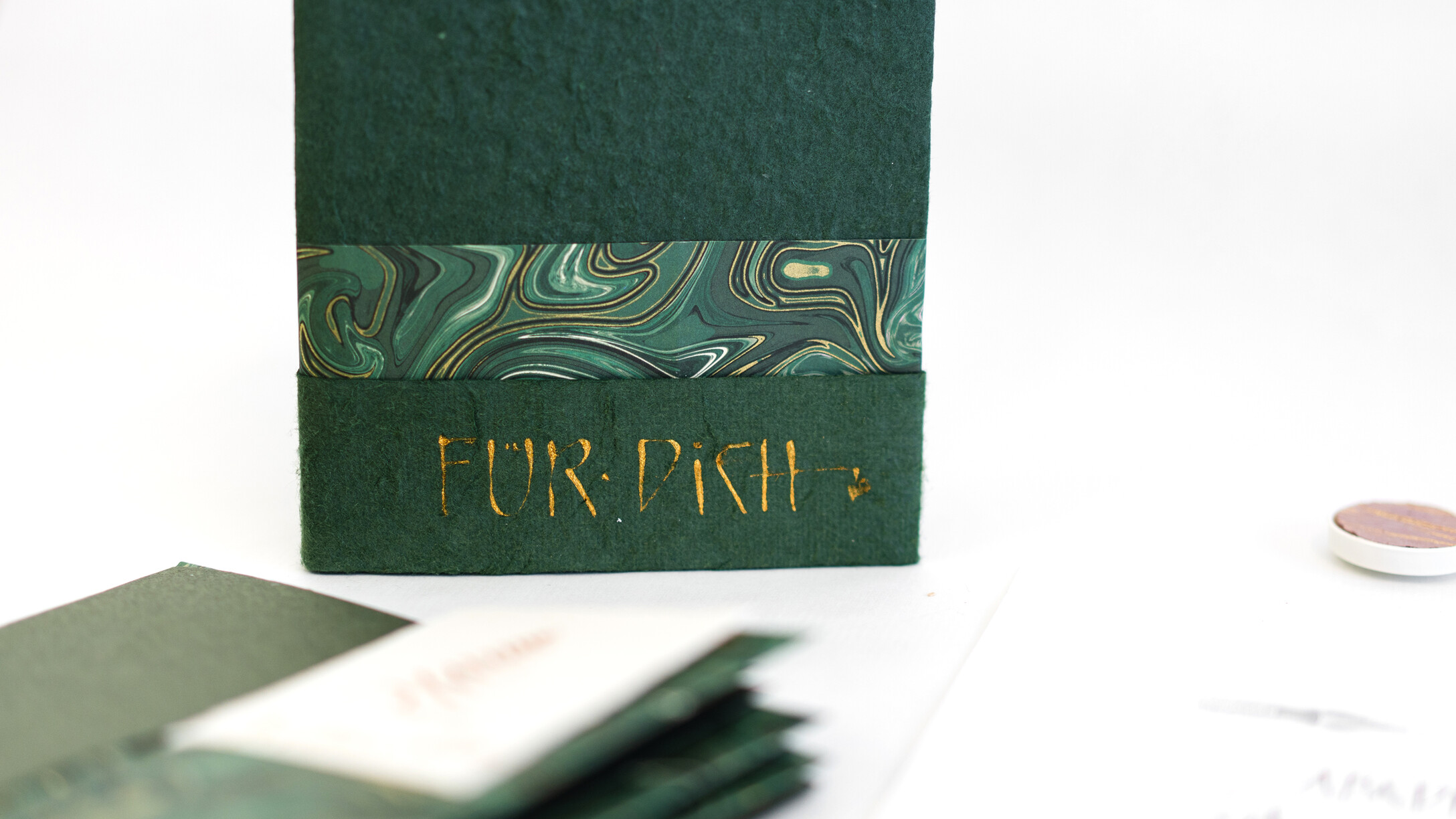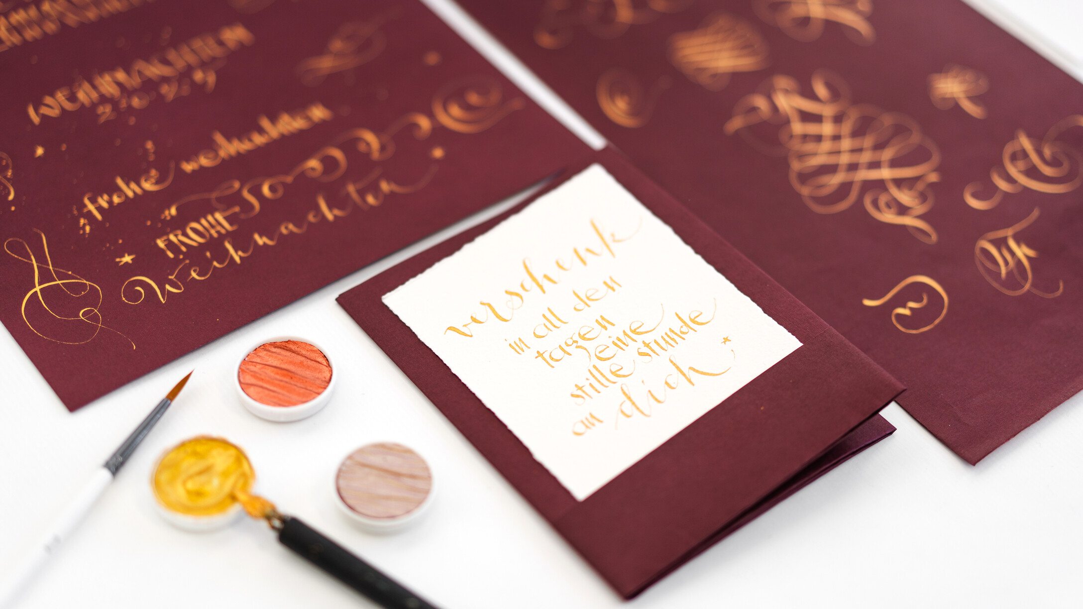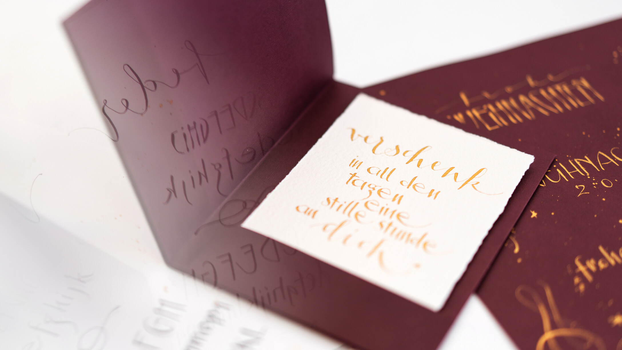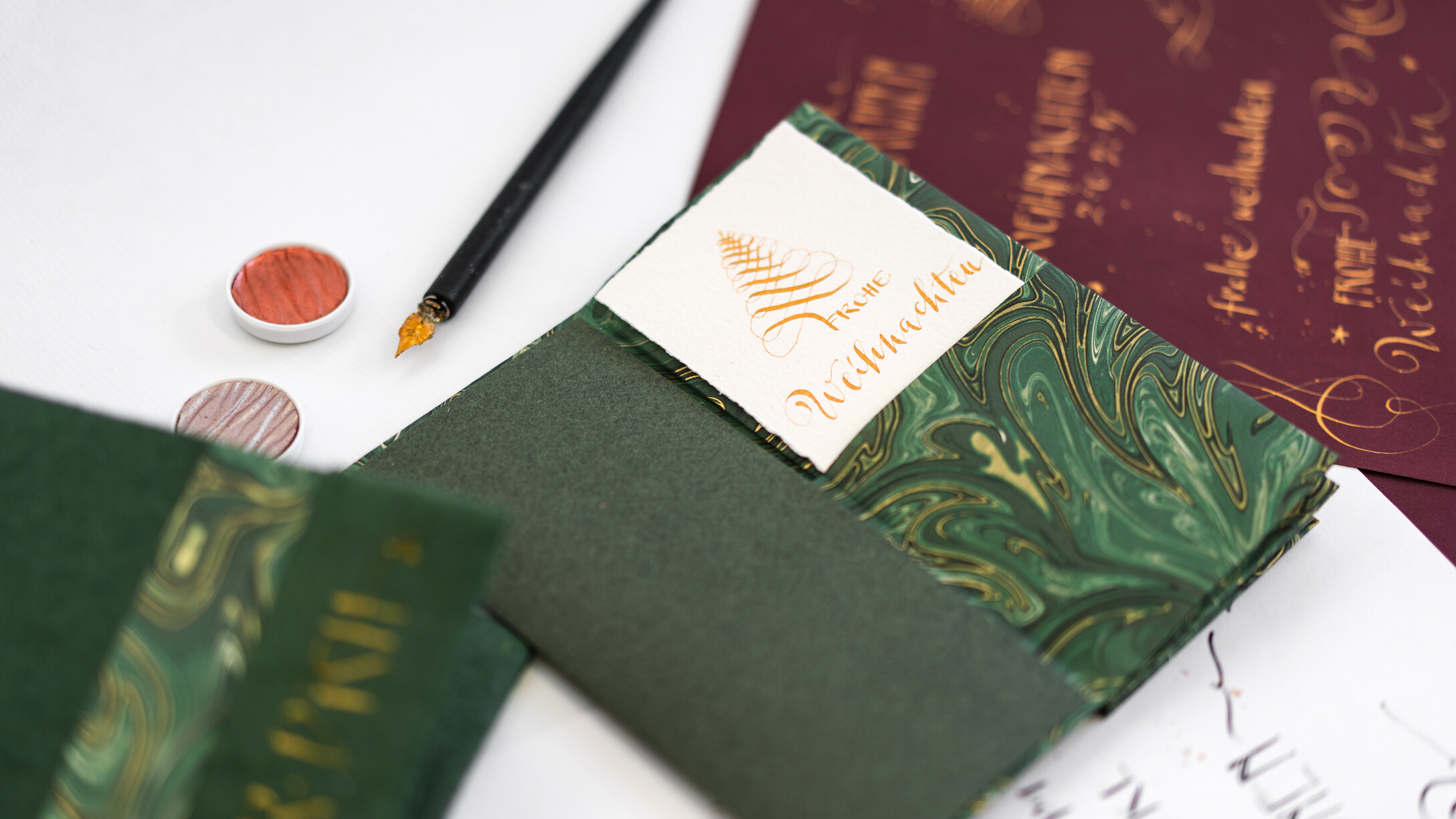 Weiters besteht die Möglichkeit, eine Vielzahl an neuen Buchstabenkombinationen, alle geschrieben mit der Spitzfeder, auszuprobieren. Es kann gefaltet, gestempelt, geprägt oder auch vergoldet werden in diesem kreativen Tun, entstehen sehr schöne Karten, Kuverts, Leporellos und Vieles mehr.