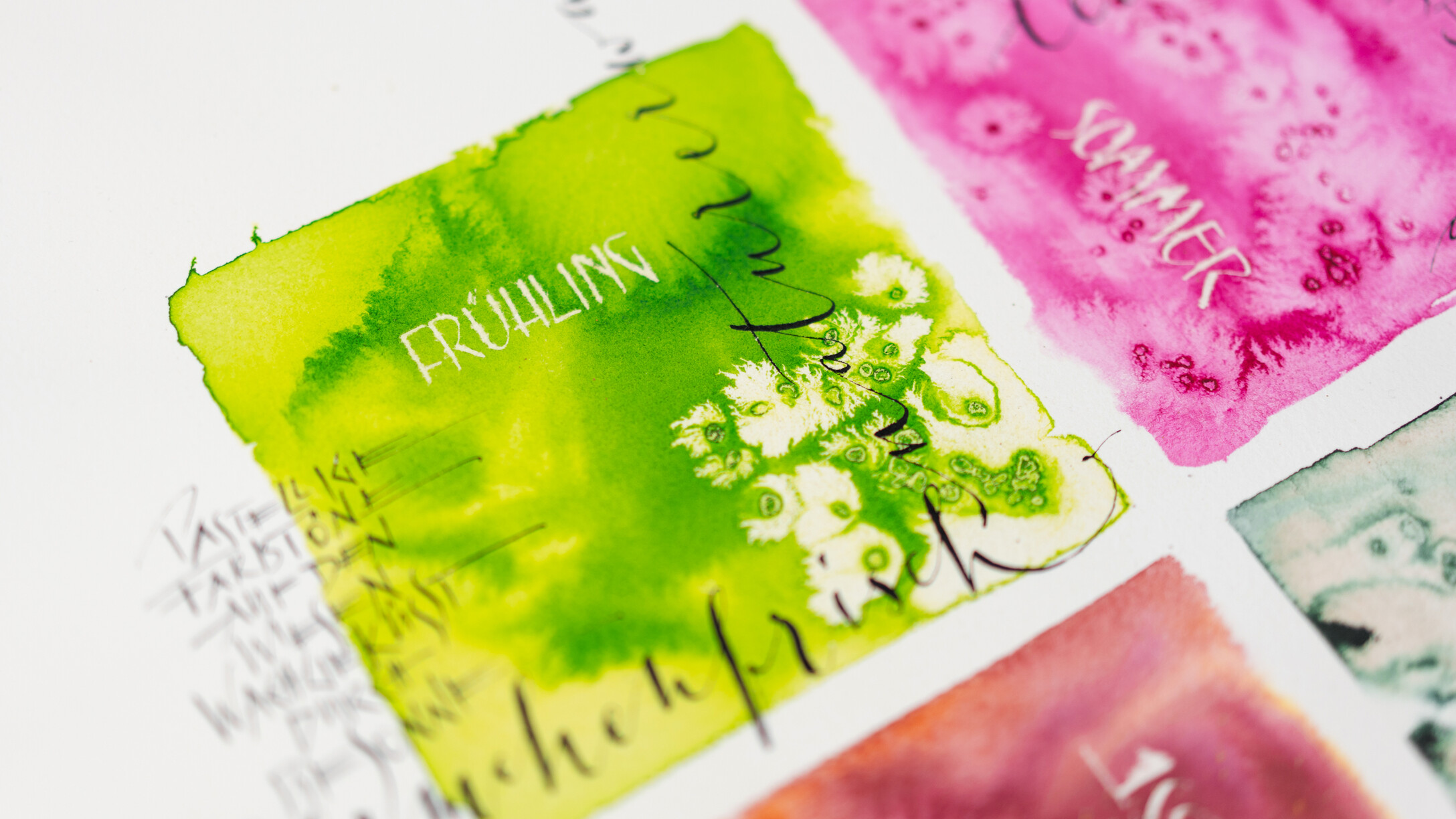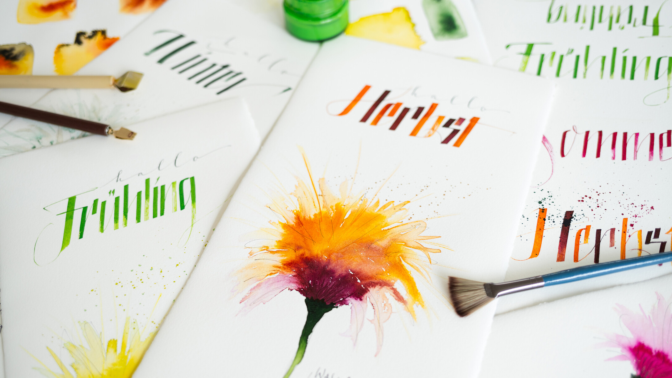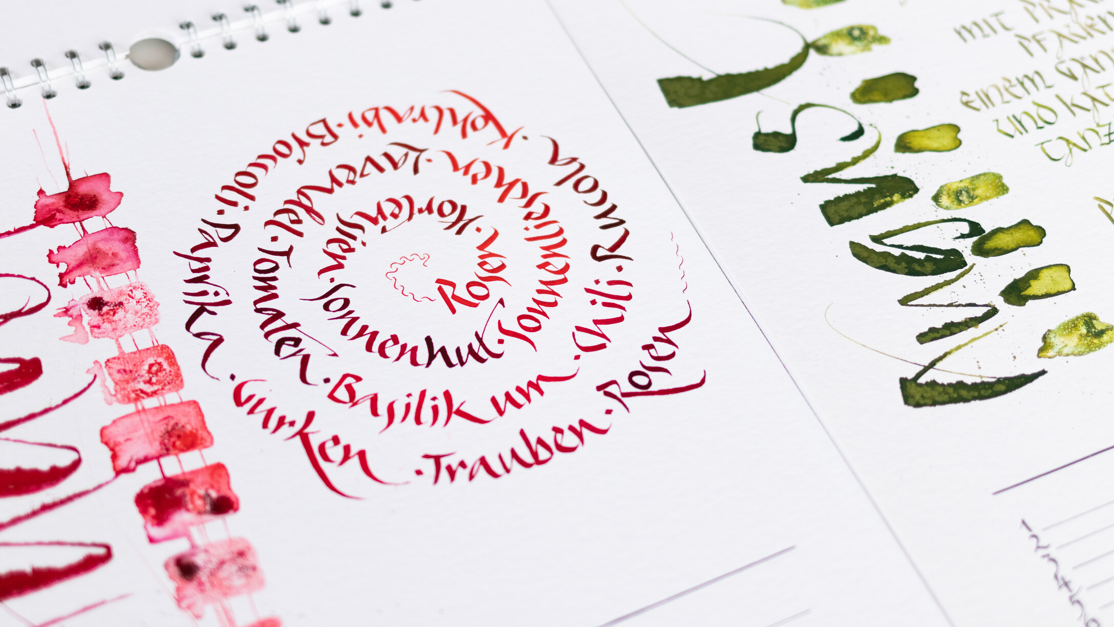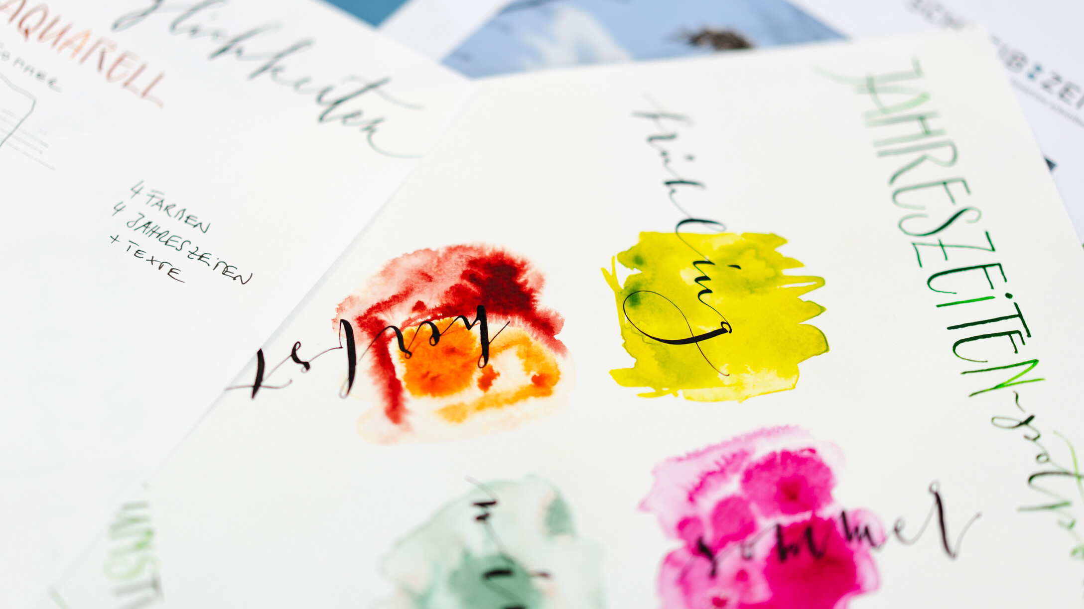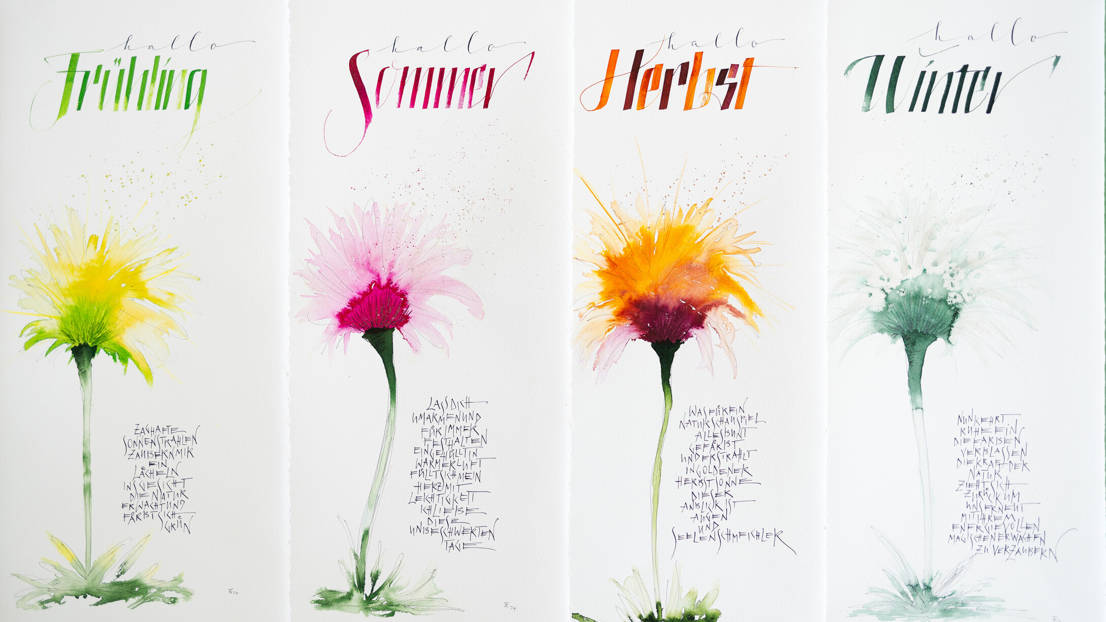 An 4 Samstagen verteilt auf das ganze Jahr arbeiten wir an jeweils drei Kalenderblättern. Sabine begleitet uns dabei, individuelle und persönliche Texte passend zu jedem Monat des Jahres selbst zu verfassen. Die spielerische Methode des kreativen Schreibens machen dies besonders leicht. Ich helfe euch dabei, eure eigenen Texte kalligraphisch auf das Papier zu bringen. Es gibt eine Vielzahl an Gestaltungsmöglichkeiten: von schlichten Farbtupfern und Finelinern, verschiedenen Schriftvariationen, bis hin zum Aquarellhintergrund beschrieben mit der Cola-Feder ist alles möglich - einfach kreativ sein. Zeitgerecht vor Weihnachten entsteht das letzte Kalenderblatt, alle Blätter samt Rückwand werden gelocht und mit einer Spirale versehen, somit ist der immerwährende Kalender fertig - für Dich selbst oder als besonderes Geschenk mit persönlicher Note.