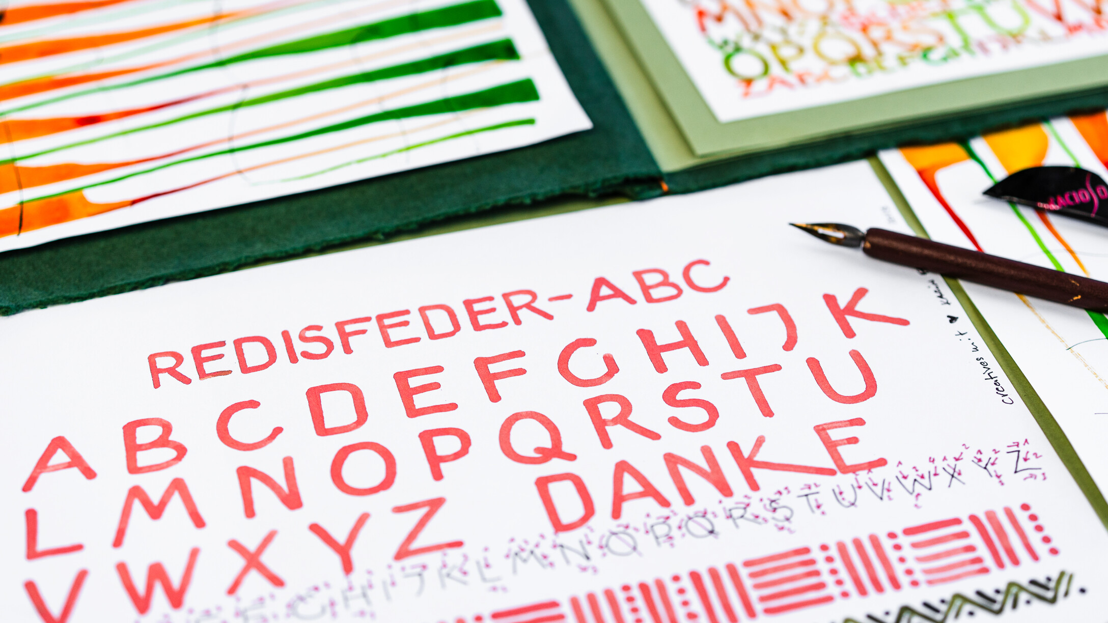 Wir schreiben mit der Spitzfeder und der Redisfeder ein einfaches Blockbuchstabenalphabet, es können auch diverse andere Schreibgeräte wie Gänsekiel, Bambusfeder oder Balsaholzstreifen ausprobiert werden. Dieser Kurs ist ideal für Anfänger sowie all jene, die in die Kalligraphie hineinschnuppern möchten bzw. für geübte Schreiber, die die vielen gestalterischen Möglichkeiten, die die verschiedenen Federn mit sich bringen, probieren möchten. Neben dem Erlernen der Schrift informiere ich Euch über Papier und Material. Bei dem Kurs entstehen mehrere Schriftblätter, die dann zu einem Leporello zusammengefasst werden.
