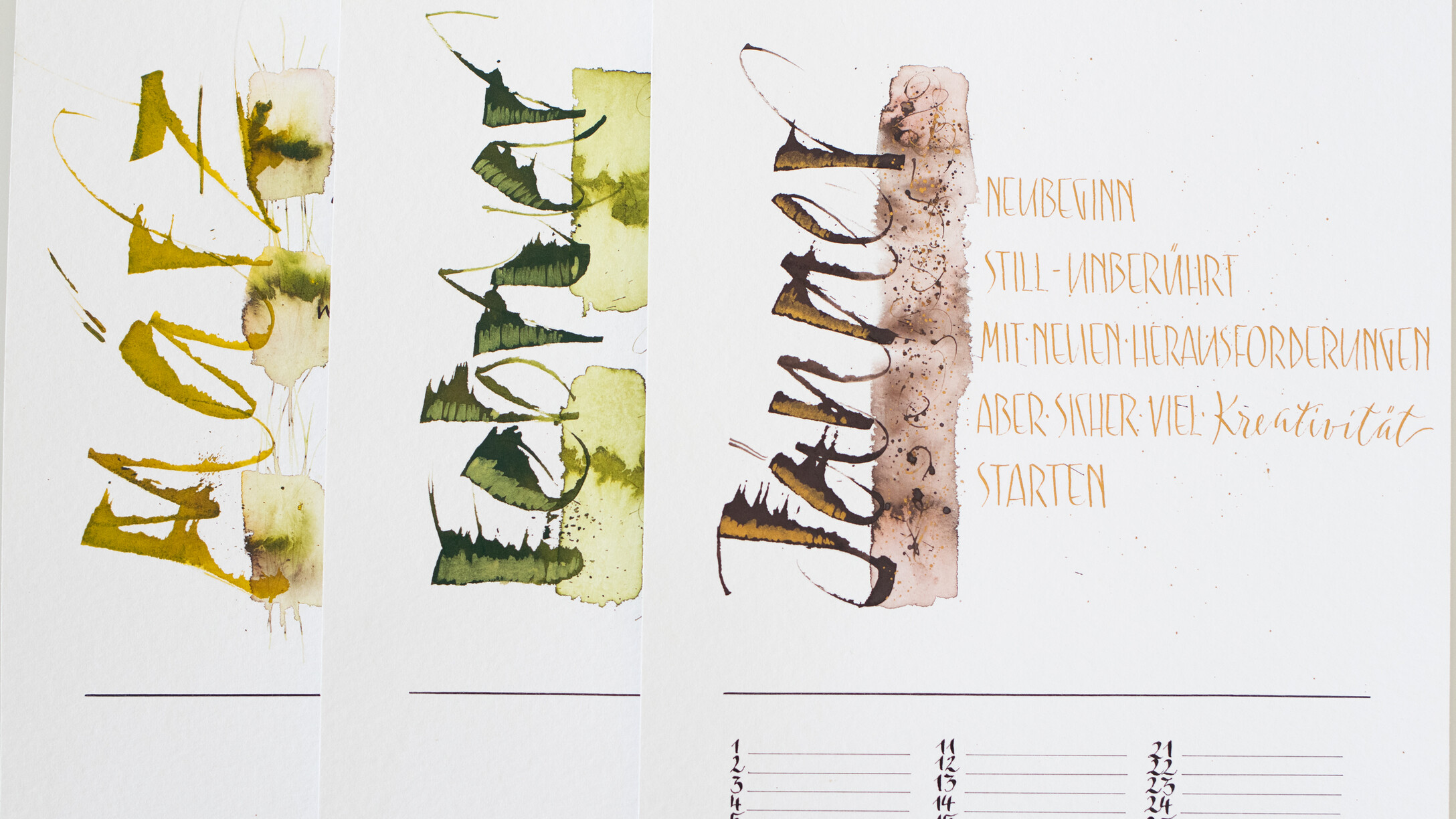 An 4 Samstagen verteilt auf das ganze Jahr arbeiten wir an jeweils drei Kalenderblättern. Sabine begleitet uns dabei, individuelle und persönliche Texte passend zu jedem Monat des Jahres selbst zu verfassen. Die spielerische Methode des kreativen Schreibens machen dies besonders leicht. Ich helfe euch dabei, eure eigenen Texte kalligraphisch auf das Papier zu bringen. Es gibt eine Vielzahl an Gestaltungsmöglichkeiten: von schlichten Farbtupfern und Finelinern, verschiedenen Schriftvariationen, bis hin zum Aquarellhintergrund beschrieben mit der Cola-Feder ist alles möglich - einfach kreativ sein. Zeitgerecht vor Weihnachten entsteht das letzte Kalenderblatt, alle Blätter samt Rückwand werden gelocht und mit einer Spirale versehen, somit ist der immerwährende Kalender fertig - für Dich selbst oder als besonderes Geschenk mit persönlicher Note.