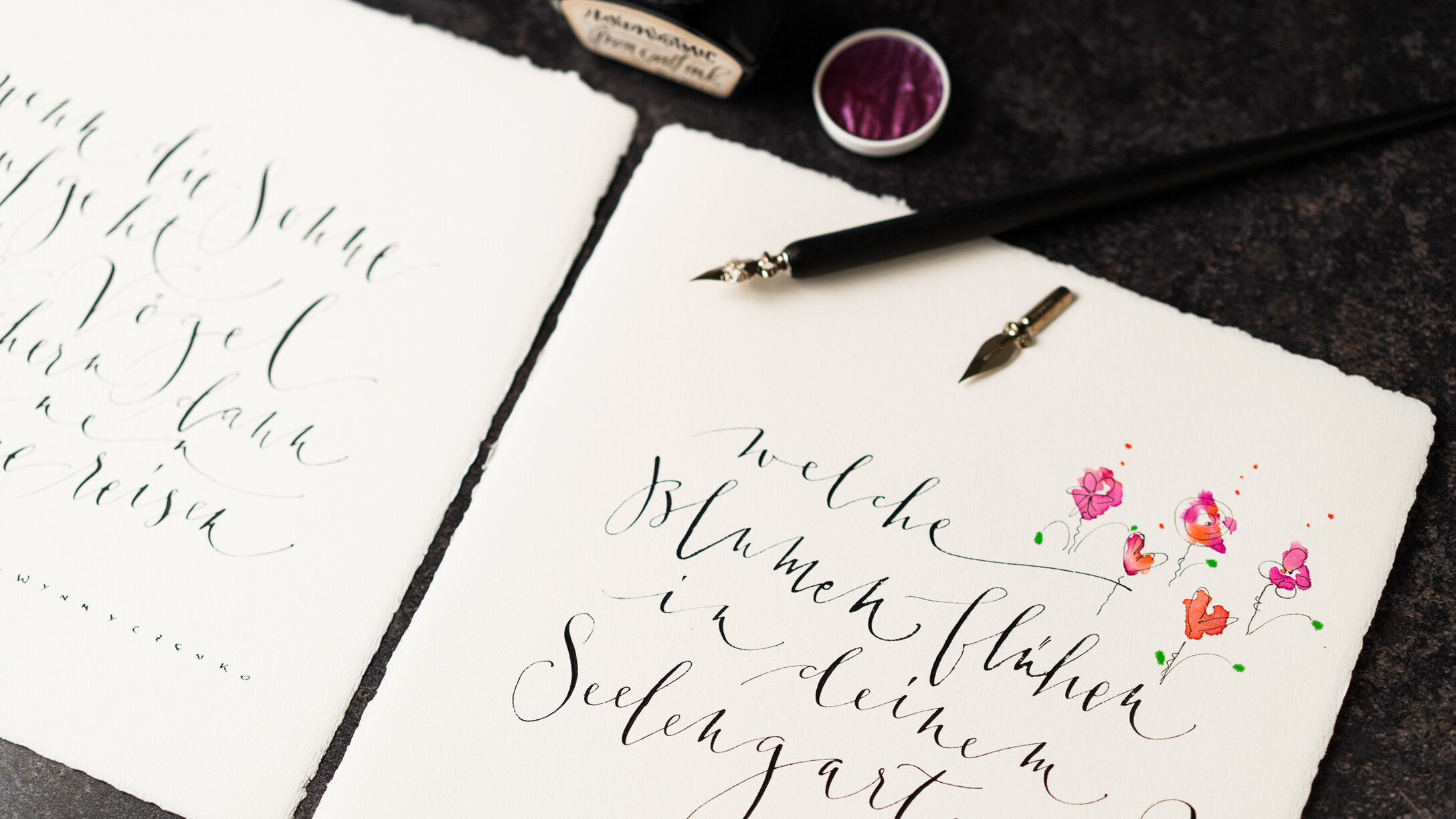 In diesem Kurs lernen wir die Klein- bzw. Großbuchstaben dieser Schrift, Tipps und Tricks rund um Feder, Tusche und Papier und die gestalterischen Einsatzmöglichkeiten dieser Schrift.