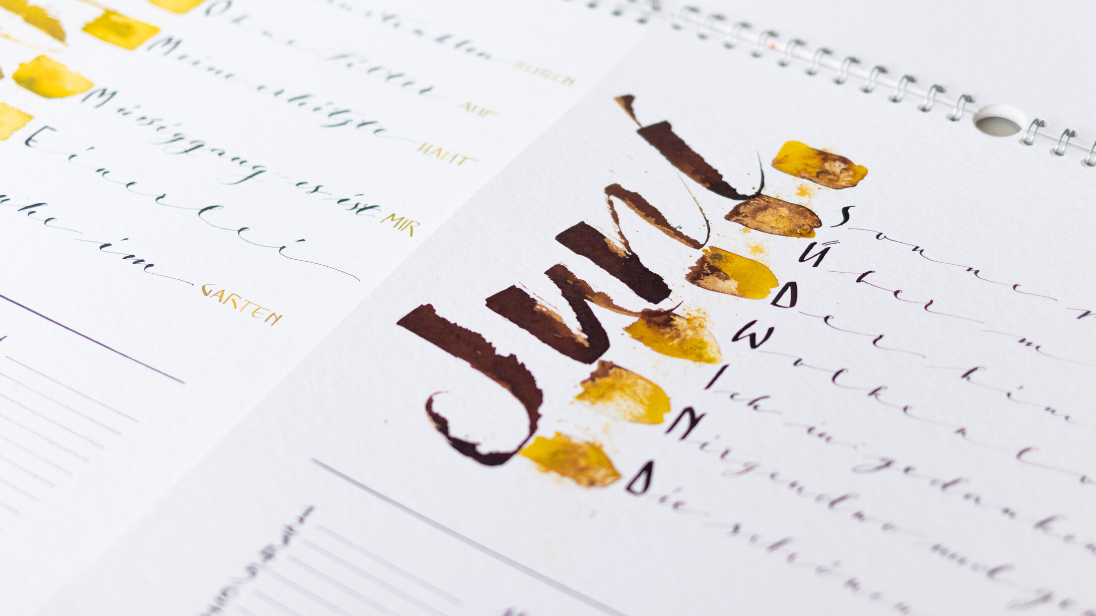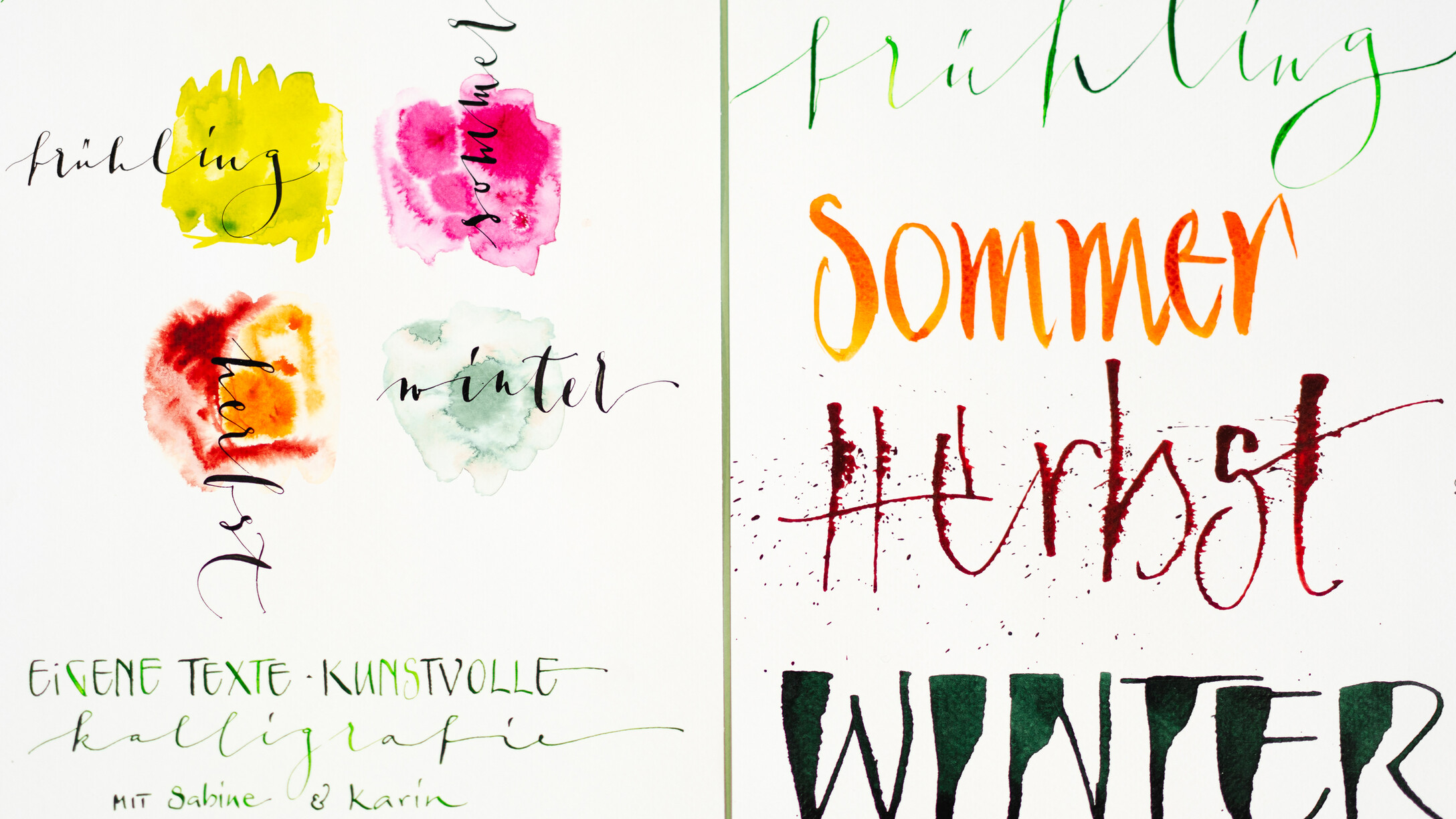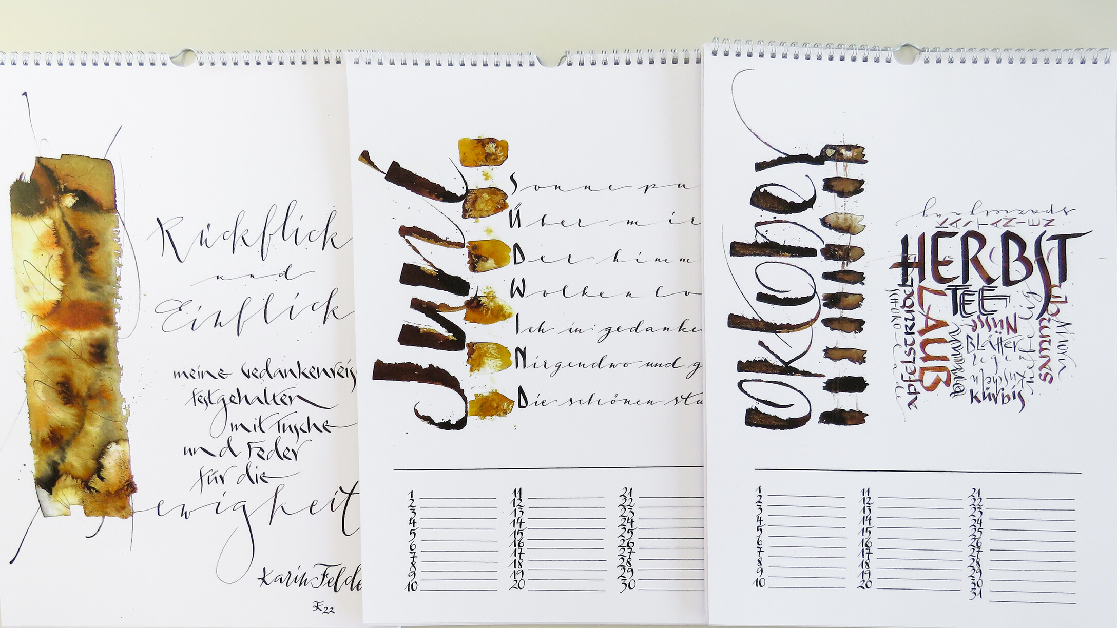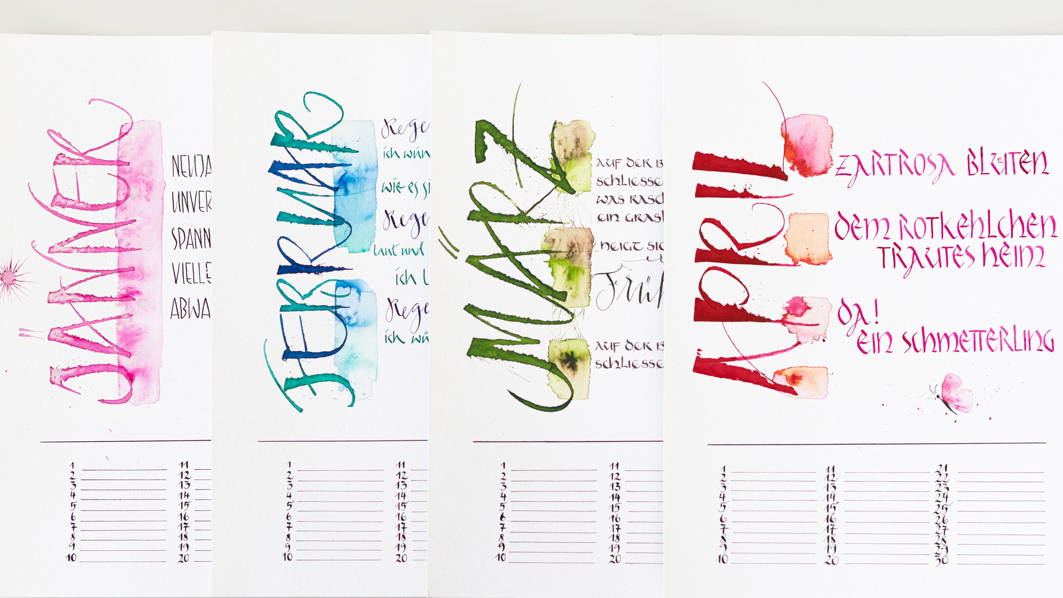 An 4 Samstagen verteilt auf das ganze Jahr arbeiten wir an jeweils drei Kalenderblättern. Sabine begleitet uns dabei, individuelle und persönliche Texte passend zu jedem Monat des Jahres selbst zu verfassen. Die spielerische Methode des kreativen Schreibens machen dies besonders leicht. Ich helfe euch dabei, eure eigenen Texte kalligraphisch auf das Papier zu bringen. Es gibt eine Vielzahl an Gestaltungsmöglichkeiten: von schlichten Farbtupfern und Finelinern, verschiedenen Schriftvariationen, bis hin zum Aquarellhintergrund beschrieben mit der Cola-Feder ist alles möglich - einfach kreativ sein. Zeitgerecht vor Weihnachten entsteht das letzte Kalenderblatt, alle Blätter samt Rückwand werden gelocht und mit einer Spirale versehen, somit ist der immerwährende Kalender fertig - für Dich selbst oder als besonderes Geschenk mit persönlicher Note.