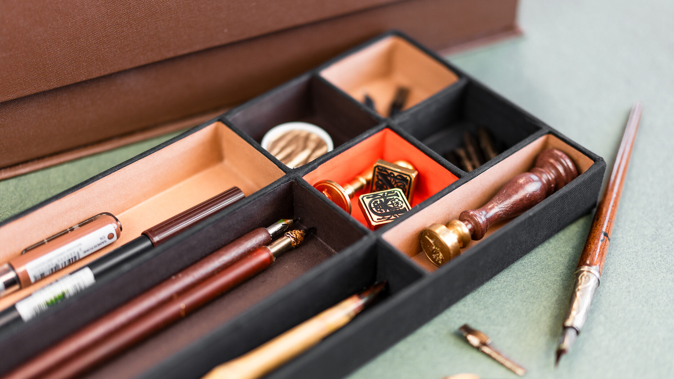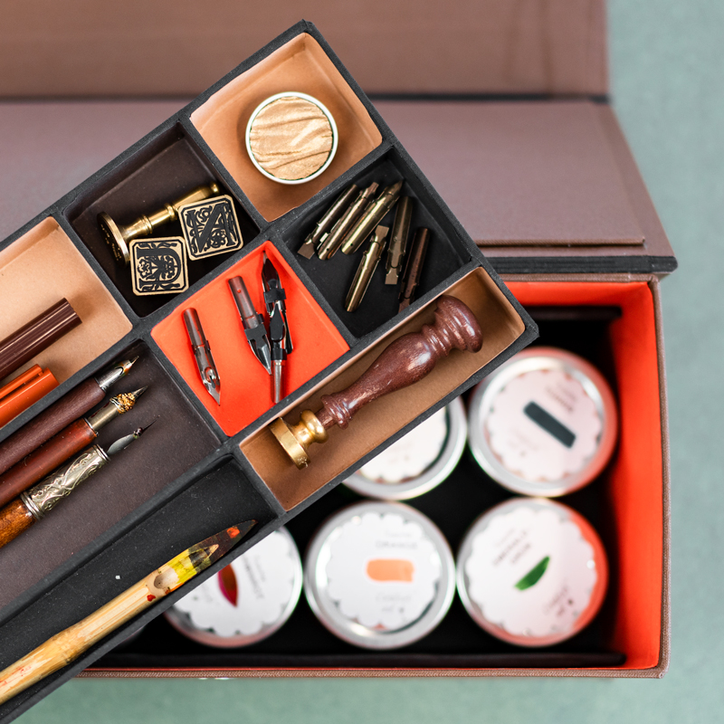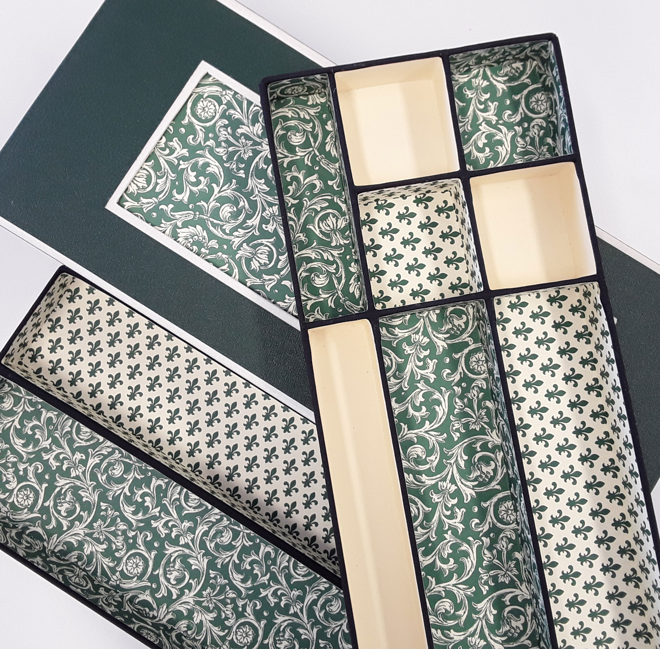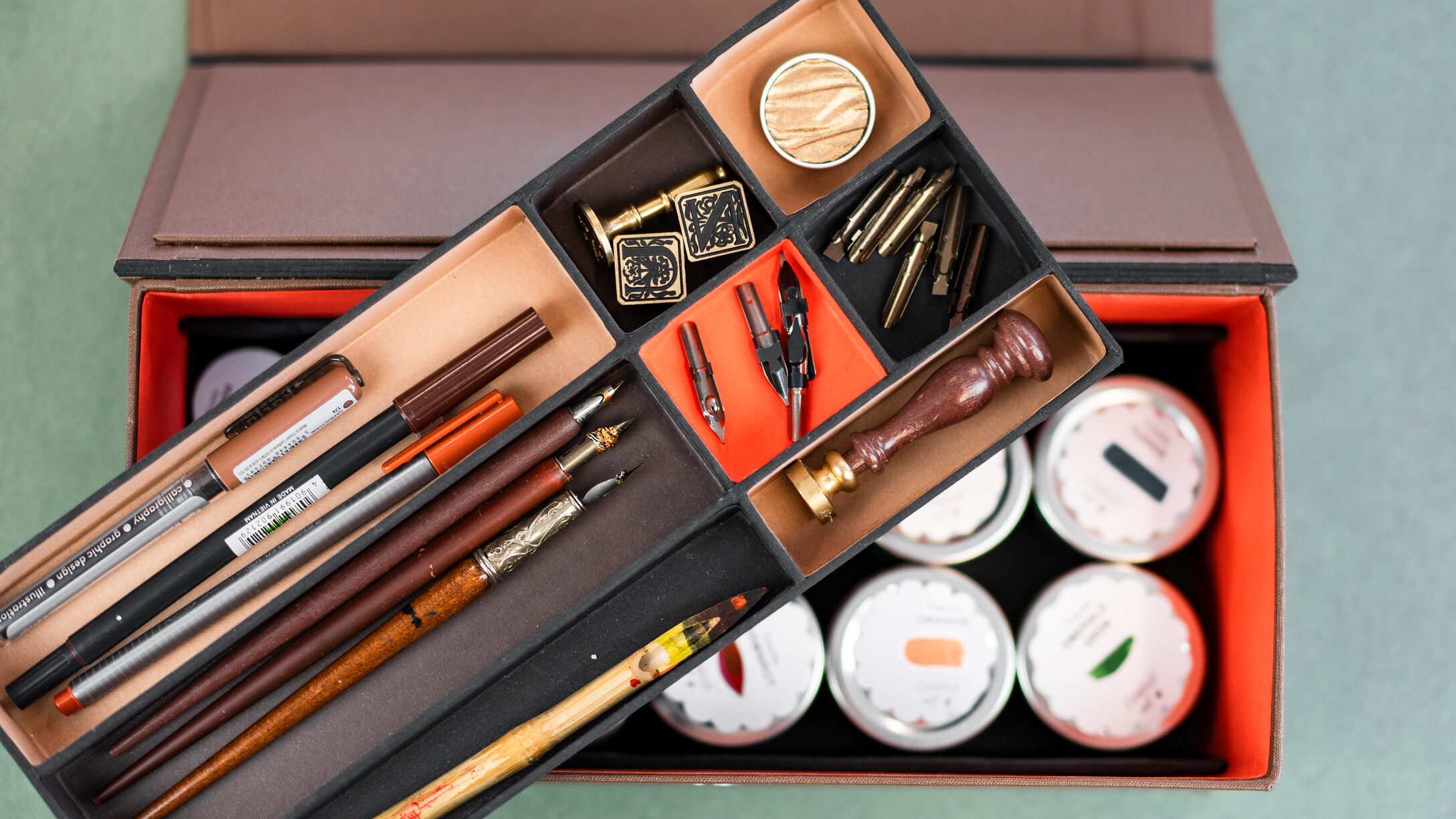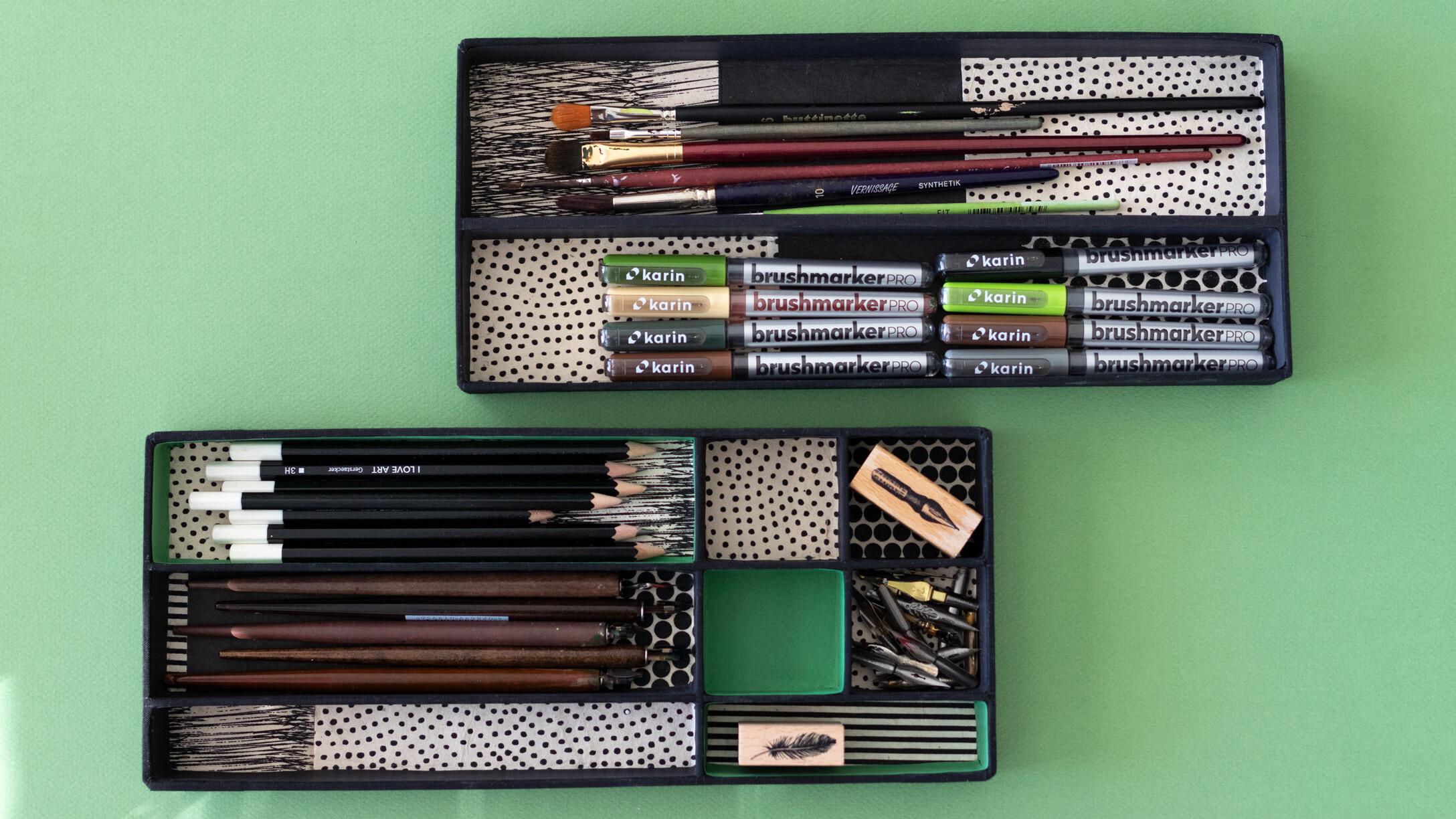 Aus stabiler Graupappe fertigen wir eine Schachtel mit Klappdeckel, die mit Buchbinderleinen überzogen wird. Weiters stellen wir zwei herausnehmbare Etagen her, die farblich, aber auch kalligraphisch individuell gestaltet werden können. So entstehen sehr persönliche Unikate für eure Kalligraphie-Utensilien.